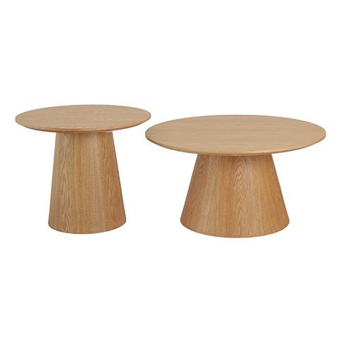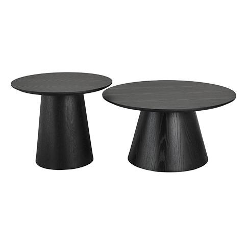 De Bayan-serie omvat vier ronde bijzettafels, beschikbaar in twee verschillende modellen: een hoge, slanke variant en een lage, brede variant. Gemaakt van essenfineer met een matte afwerking, zijn ze verkrijgbaar in zowel zwart als een natuurlijke eikenlook. Deze tafels zijn afzonderlijk goed te combineren, maar vormen ook een prachtige set die naadloos past in diverse interieurstijlen.