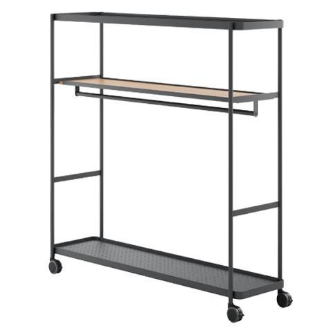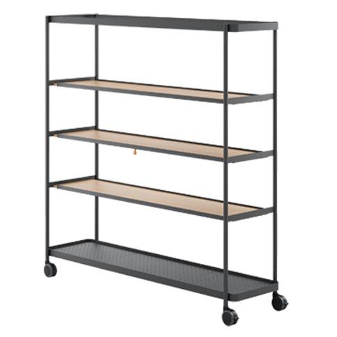 De Boards Shelves is heeft een TV-kast en een strak zwart metalen frame met warme houten accenten. Voorzien van meerdere legplanken en handige wieltjes, waardoor de kast eenvoudig te verplaatsen is. Ideaal voor vergaderruimtes, hospitality of flexibel ingerichte kantoren.