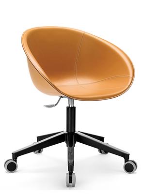 De Gliss collectie heeft een knusse en ergonomische vorm, geïnspireerd op de iconische stoelen uit de jaren '50, met een opvallend gat in de schaal. De collectie valt op door zijn comfort en functionaliteit, dankzij de bochtige armleuningen die het lichaam omarmen en het gebruiksgemak. De fauteuil heeft een vijfsteronderstel van spuitgietaluminium met wielen.