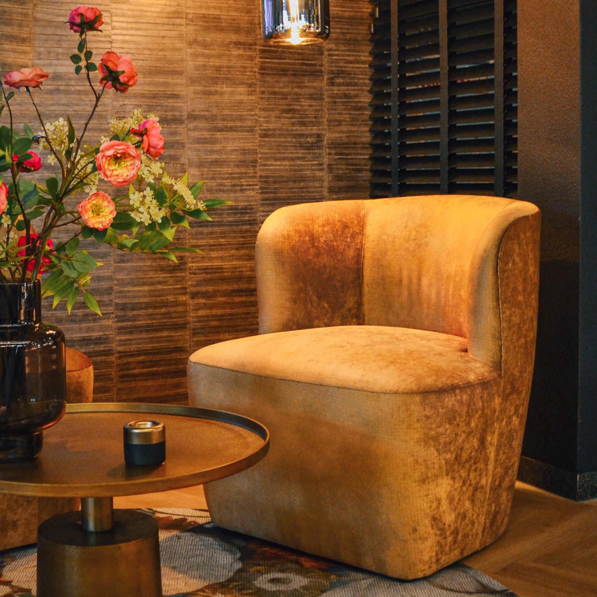 De Valerie fauteuil is een compact en minimalistisch meubelstuk. Hij staat op vier platte, zwarte voetjes die niet in het oog springen. De ronde rugleuningen zorgt voor genoeg ondersteuning en zorgt voor een actieve zit.