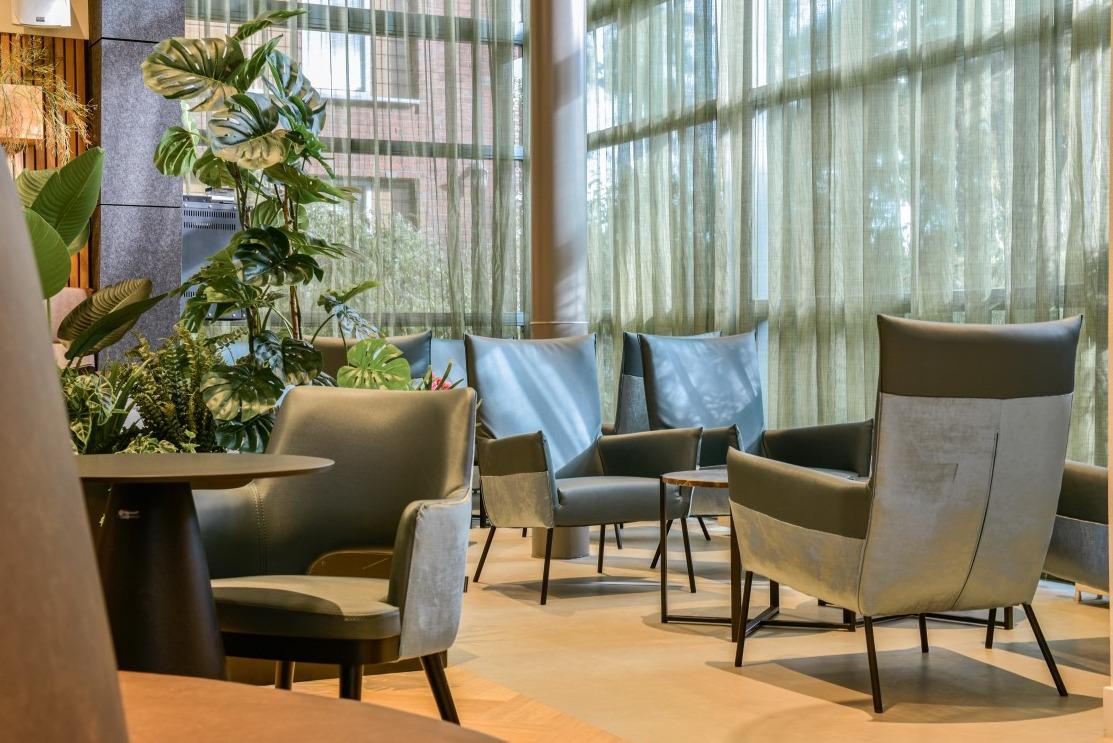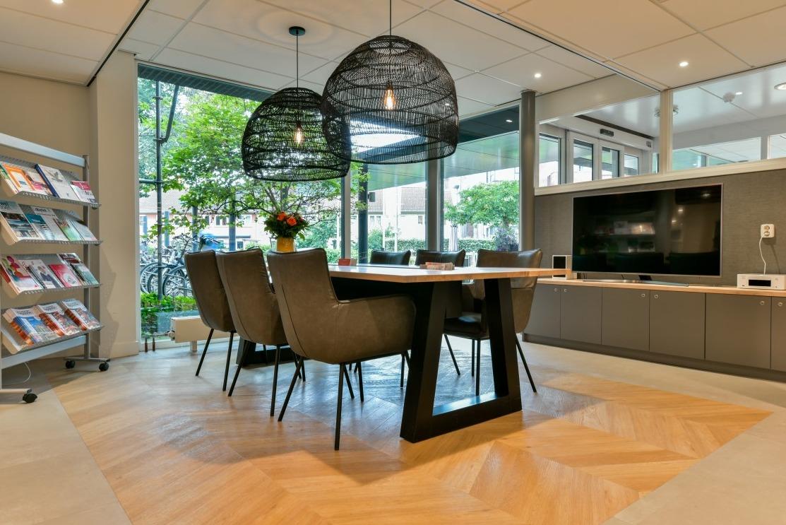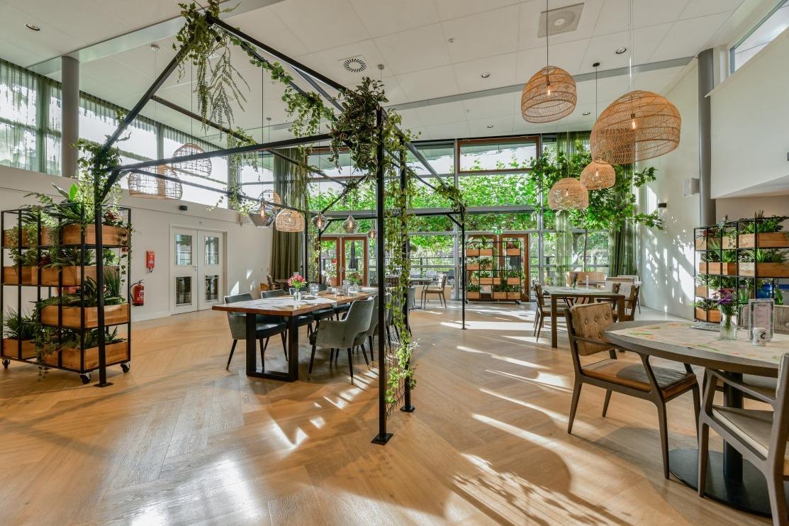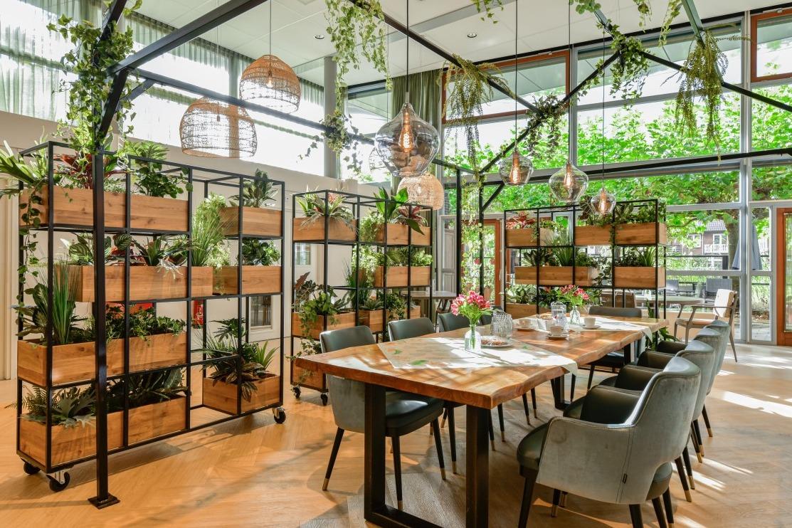 Het binnen- en buitengevoel in deze ruimte van Woonzorgcentrum Visserhuis is op een bijzondere manier met elkaar verweven. Natuurlijke roomdividers, vele zitmogelijkheden en overal groenbeleving!