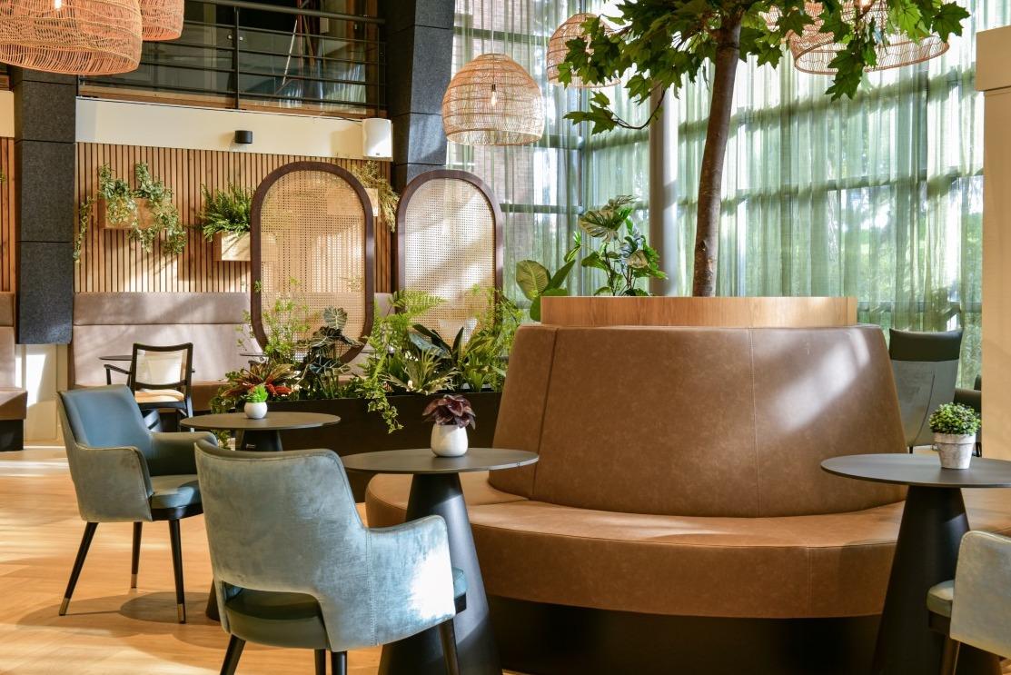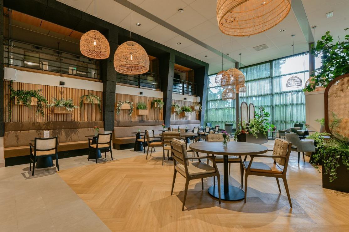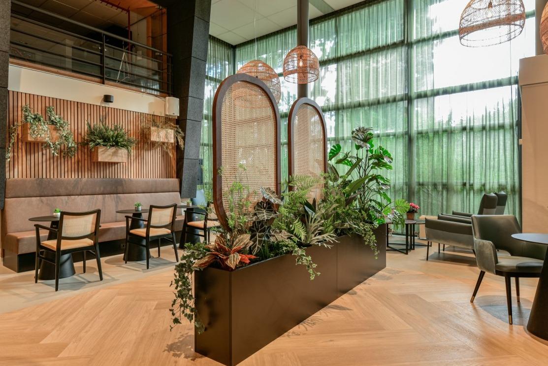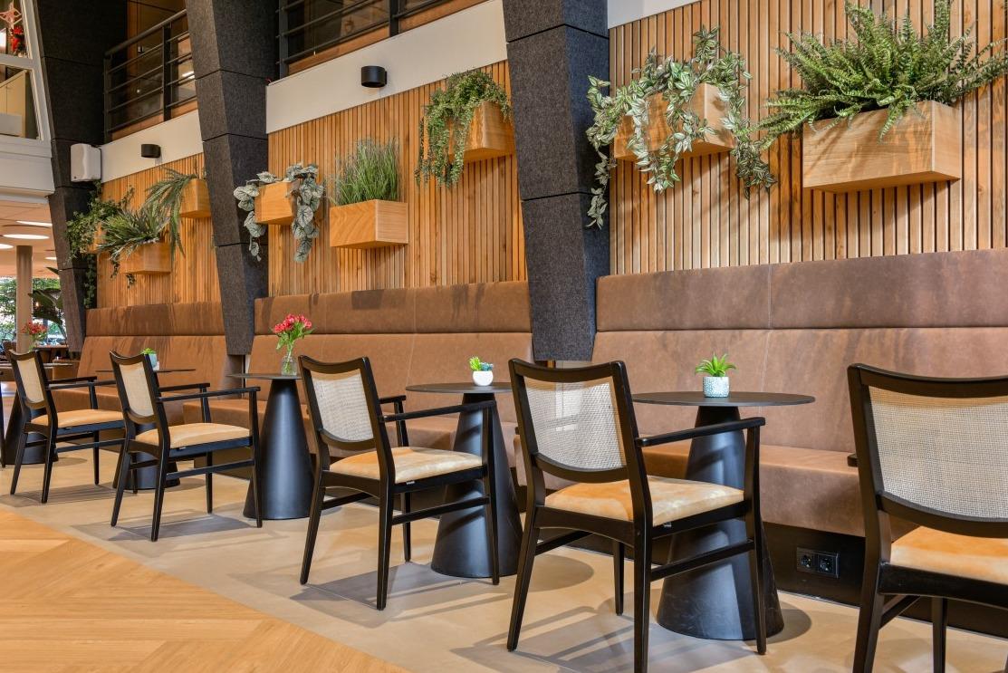 Het binnen- en buitengevoel in deze ruimte van Woonzorgcentrum Visserhuis is op een bijzondere manier met elkaar verweven. Natuurlijke roomdividers, vele zitmogelijkheden en overal groenbeleving!